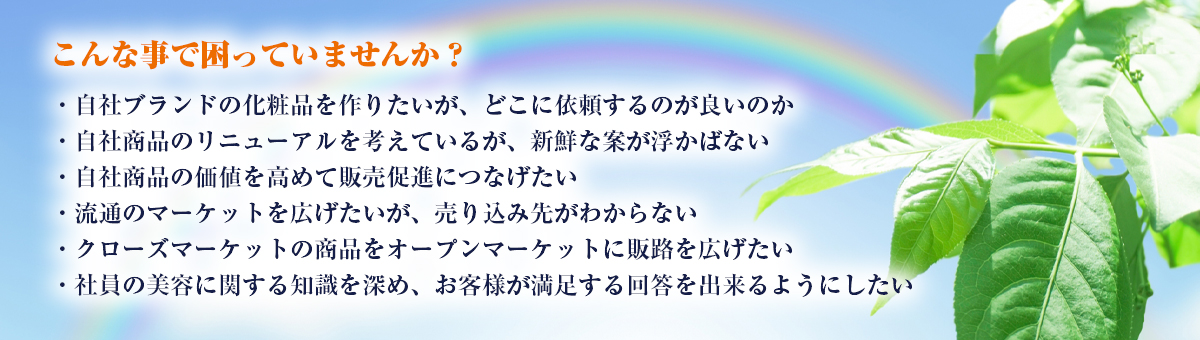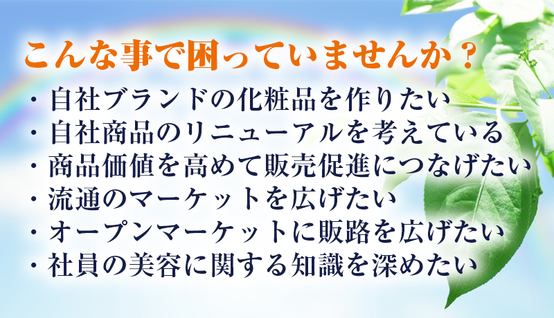化粧品及び医薬部外品・日用品雑貨のコンサルタント業・化粧品及び医薬部外品・日用品雑貨の製造及び販売・化粧品の輸出入及び販売・日用品雑貨の輸出入及び販売